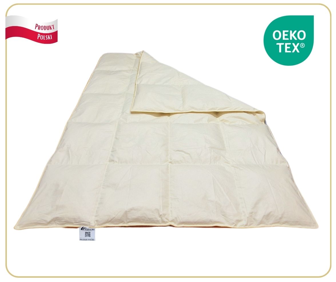 Kołdra puchowa w całości wyprodukowana w Polsce z certyfikowanych materiałów. Wspieraj polskich producentów i polskie produkty. Nasze kołdry puchowe posiadają roczną gwarancję