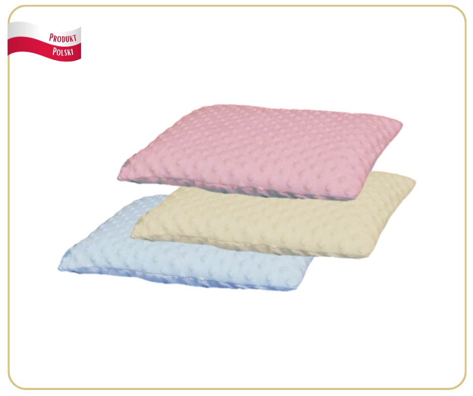 Podusia uszyta z Minky wypełniona jest antyalergiczną włókniną o gramaturze 100 g/m², która zapewnia doskonały komfort noworodka podczas snu.